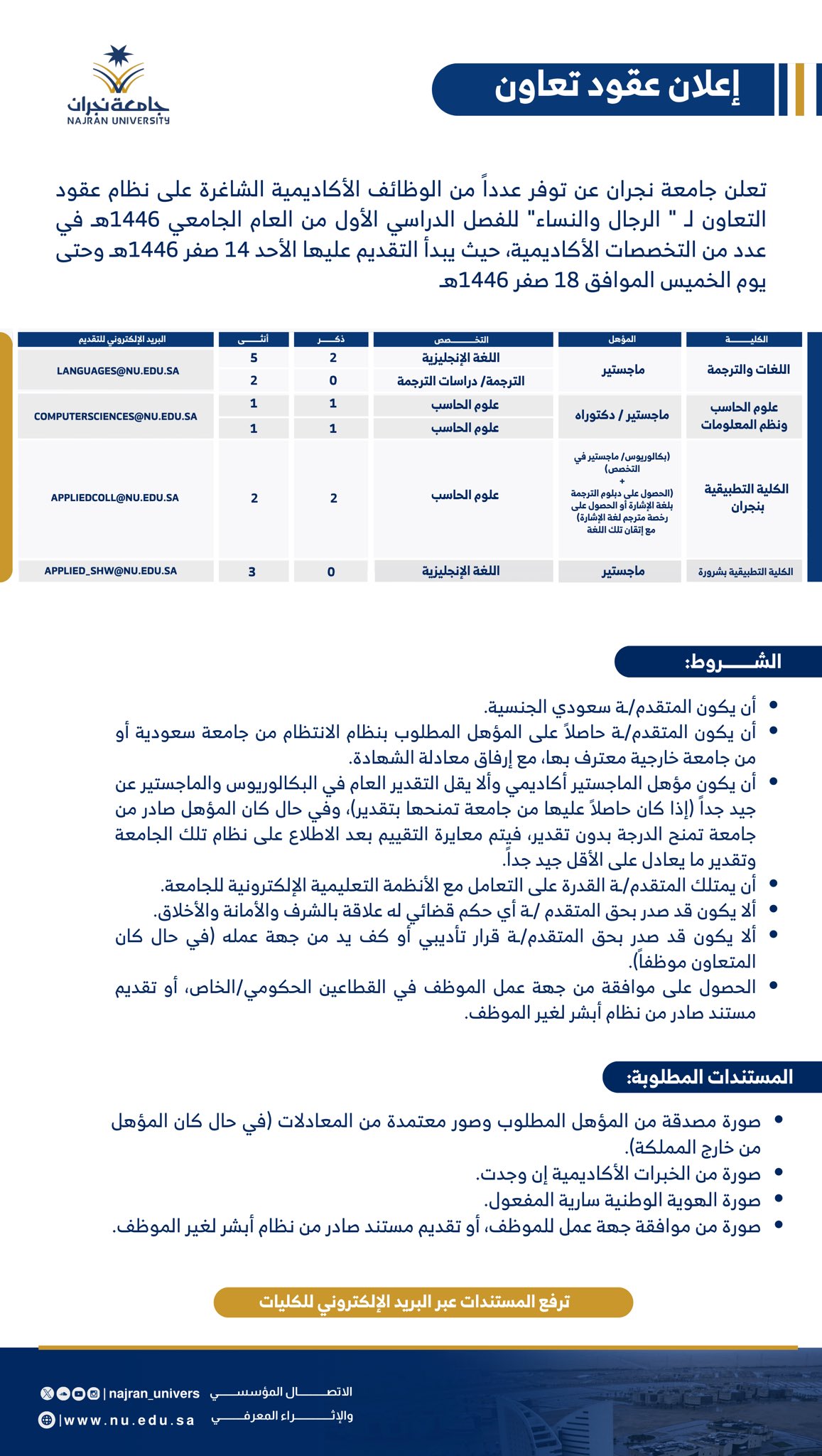 وظائف أكاديمية مؤقتة بنظام عقود التعاون للجنسين في جامعة نجران