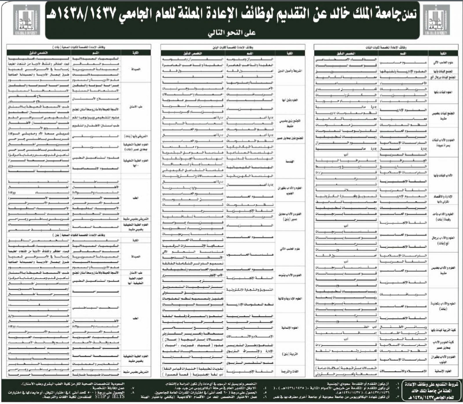 اعلنت جامعة الملك خالد عن التقديم لوظائف الإعادة للعام الجامعي لعام 1437 / 1438هـ